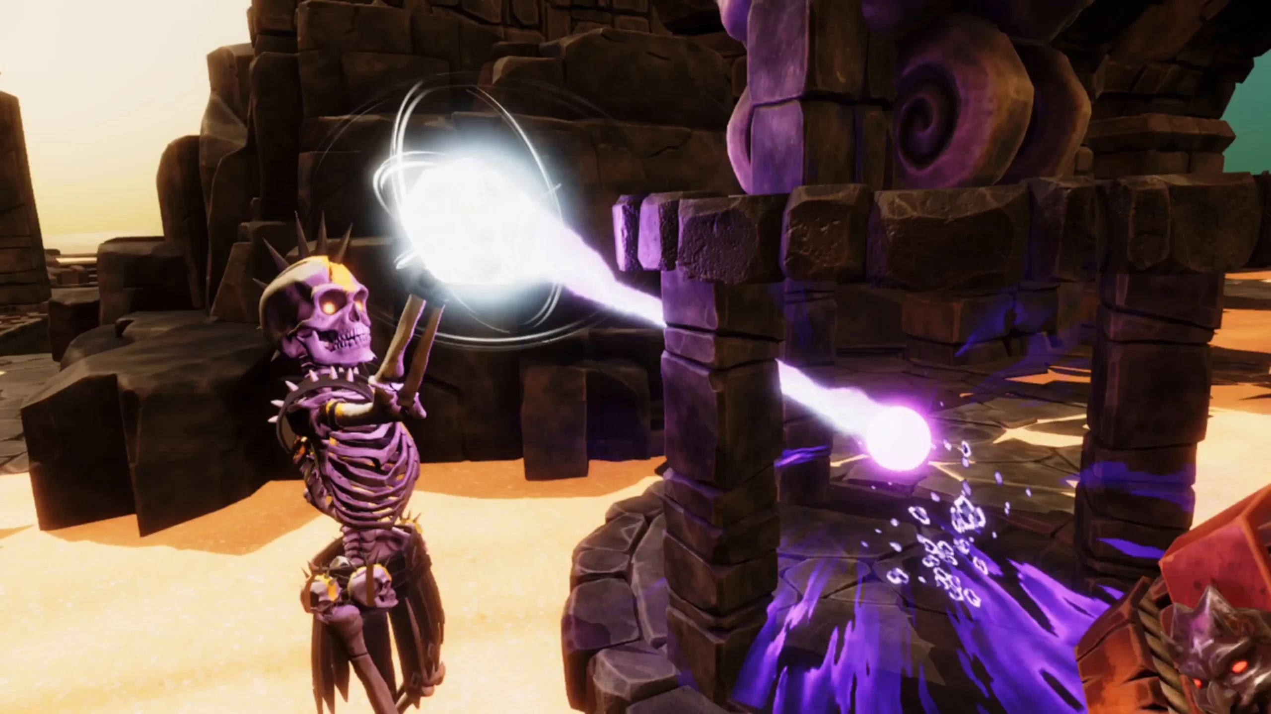 As mentioned the game comes with combat akin to GORN, but it is a bit more lite-physics based, but comes with the gore you would expect. This will see you get a number of upgradable weapons for melee and ranged attacks, as well as throwable debris littered around the realms. On top of this, you will get rechargeable special attacks. When this is activated  it will put you into God mode looking over a diorama of the realm, which you can then rain down attacks like meteors on your enemies. In order to successfully attack a realm, you will need to take out their hero and destroy the diamonds on all their defenses, which could be attacking you directly, healing or spawning goons to attack you.