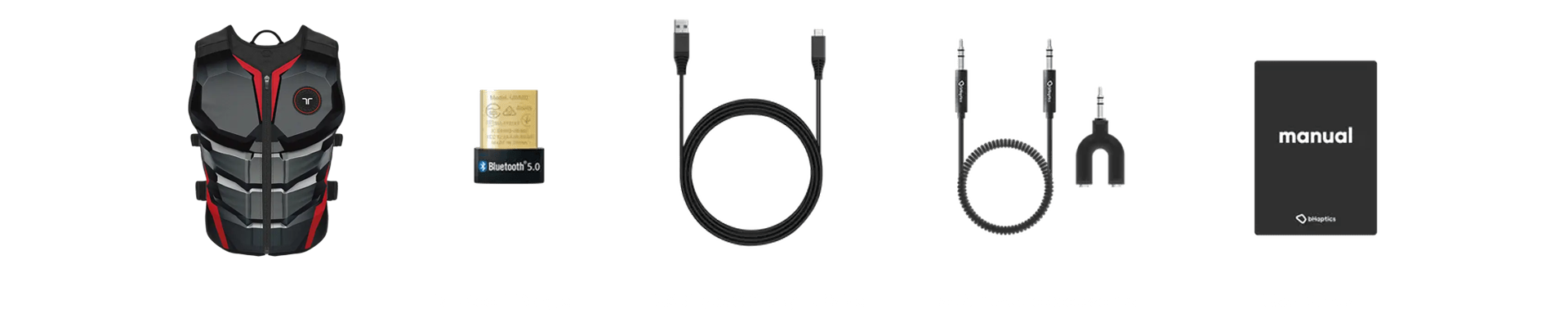 Inside the box, you will find the TactSuit Air, a Bluetooth dongle, a USB Type C charging cable, TactSuit audio accessories, a user manual, and a sheet of bHaptics stickers.
