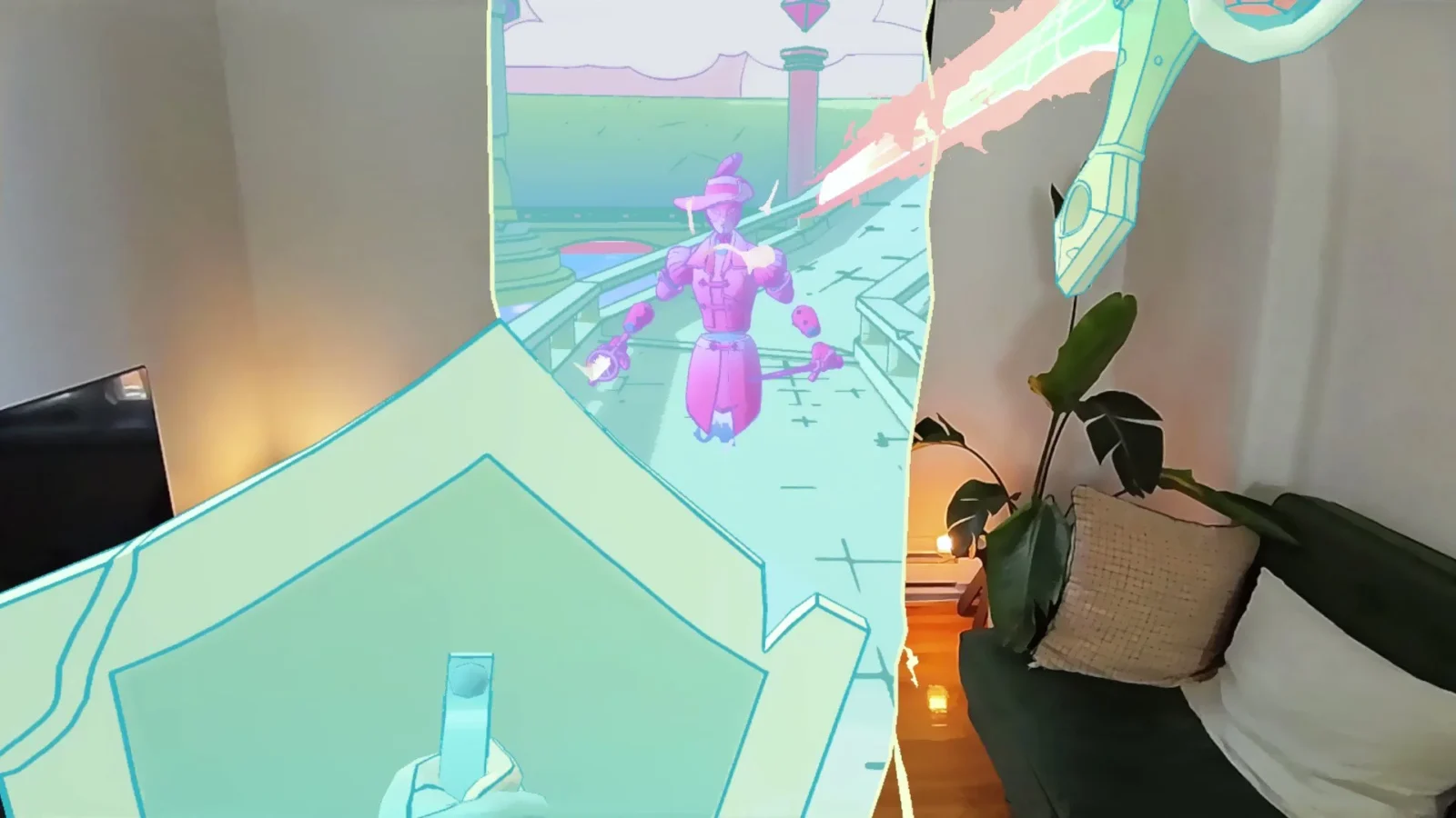 As mentioned every element of the game is available in Mixed Reality mode, meaning you can visit the dojo, take on single-player and multiplayer duels, and it just plays like it would in virtual reality. For the mixed reality to work, a portal is opened in your room. In this portal you can see the games environment in the stereoscopic 3D you would in the VR mode. This will then see the opponent stepping into your actual surroundings as they advance towards you in the portal.