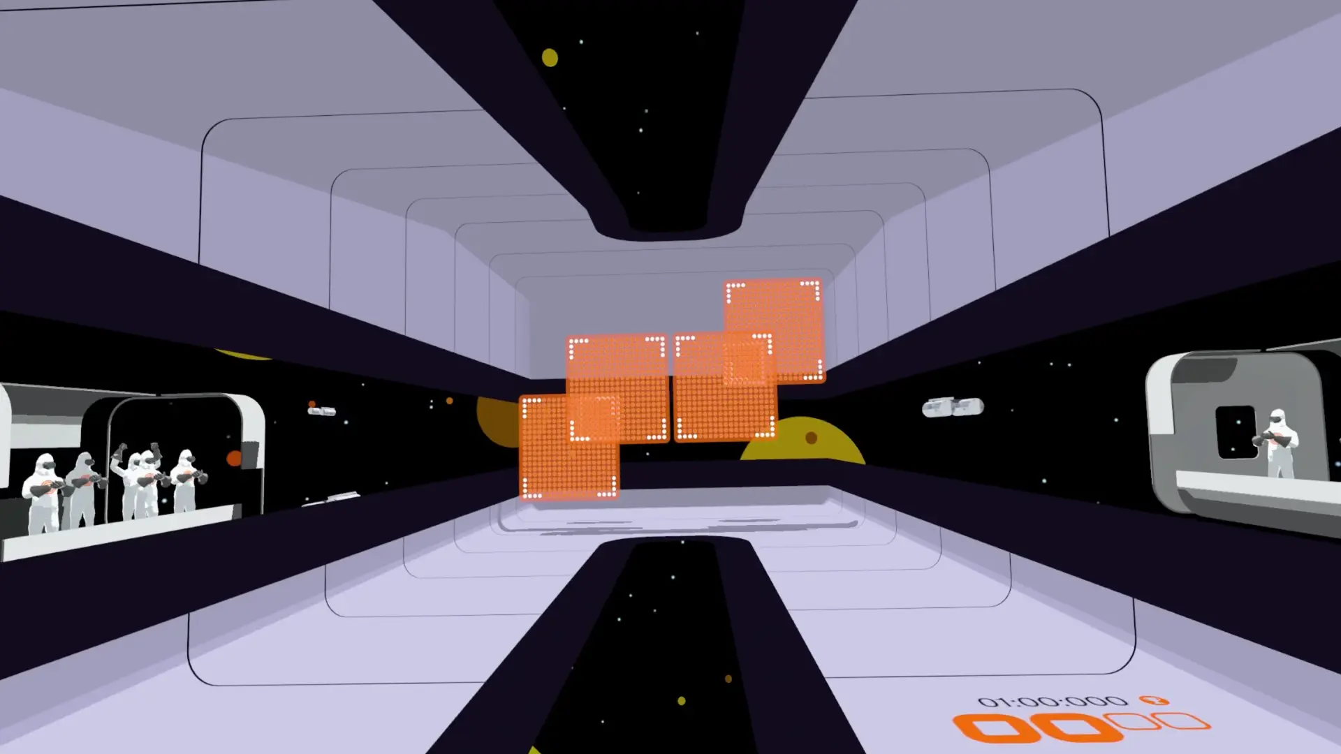 Wolf & Wood have also stayed true to the visual style of Cosmic Smash, using very simple and clean design to the stages – this has allowed the game look just as nice on the Quest 3, as it did on the PSVR2. With blocks being semi-transparent with circles on them, which allows them to show if a block has a set power-up or how many times the block will need to be hit easily by lighting up the circles. With your character models reminding me of SUPERHOT with the low poly glass look to them. Where all this might sound simple, it all comes together perfectly to allow C-Smash VRS to look great.
