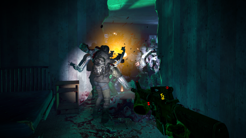 From the first attack, it was clear how well the gun-handling was implemented into the game. Like Vertigo Games previous title Arizona Sunshine, you can carry a total of four-weapons one in each hand and two on your belt. On your person you can also carry two pieces of equipment as well, which is handled the same way as used in Half-Life Alyx being placed on your wrist – which can be healing items to pipe-bombs. This equipment can be purchased in safe houses from Harvest-O-Matic machines or found on frozen Harvest Runners who have previously failed – so why not take what they no longer need.