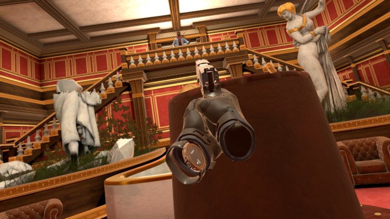 In the gameplay itself, you are going to be taking on a wave of enemies in each segment of the level, with Time Crisis type gameplay coming to mind – but, the beauty of VR having you ducking behind the cover yourself and not with a peddle. When taking out the enemies they might also drop weapons and power-ups, to get these you will need to shoot the icon. Doing this will see you provided with automatic weapons and things like more health, timed slow-motion and more – all that could become important in helping you clear that section.