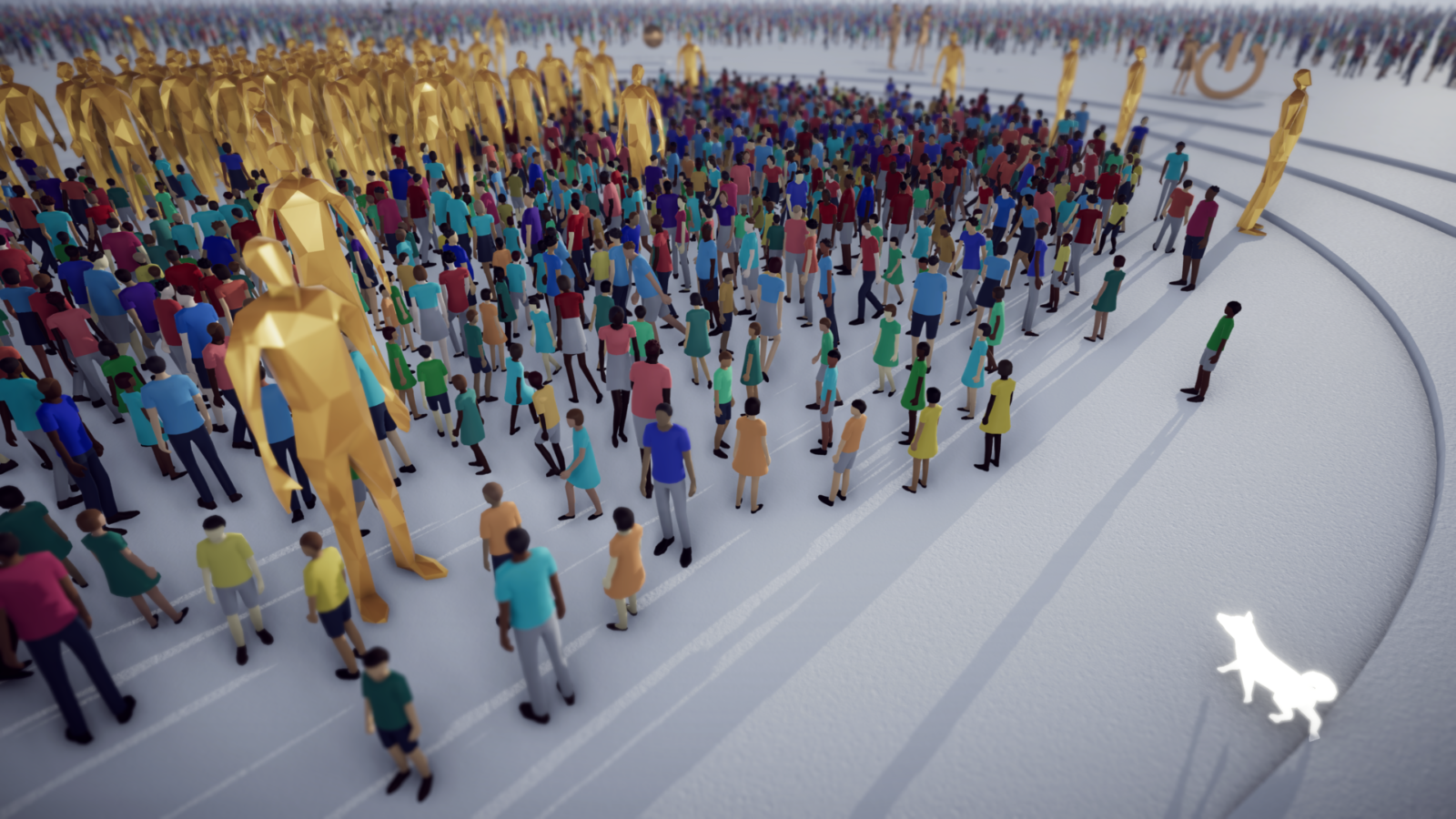 Visually the game is very minimal in design, but also striking at the same time. The levels look very minimalistic in style and are floating above the clouds, as you are guiding hordes of colourfully dressed humans across them- giving it a really nice contrast. However, when The Others enter the trials and you get the weapons to fight them, the sparks of colours as they come together look outstanding – especially on the PSVR2 displays.