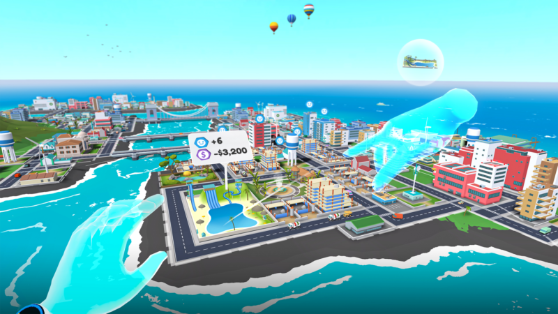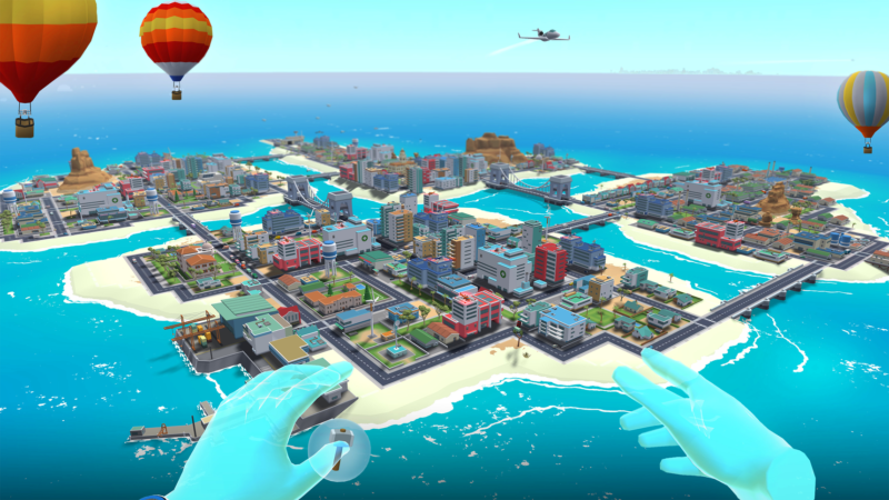 One of the big charms of Little Cities is the simplified visuals the team at Purple Yonder have gone with, making it feel perfectly crafted for the standalone device. Meaning the performance is kept and it has no loading and pop-in issues. With this allowing for them to not only bring the city, but the whole island to life, from seagulls flying about, the planes flying over from the airport, hot-air balloons floating about and natural disasters like volcanos and sand storms effecting the cities. Even the simplified graphic style keeps its charm when zooming into the island and taking in the population going about their city life.