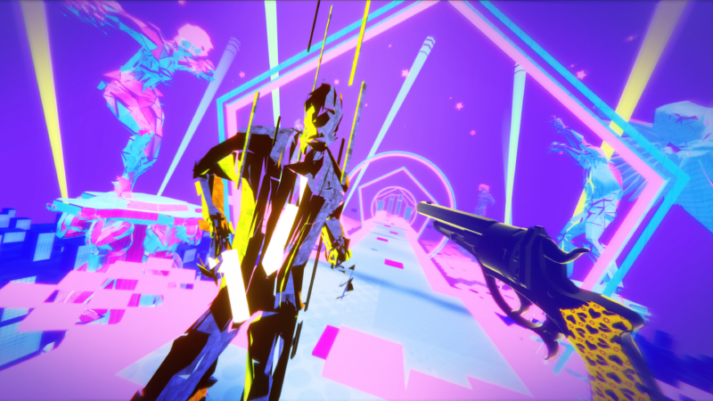 Pistol Whip’s graphical style is very eye catching, matching fractal designs with darker and brightly light neon scenes. This has allowed the team at Cloudhead Games to make a very interesting use of the visual presentation, allowing for a vivid look that can break and pulse to the sound of the scenes music. This really gives the game a style that is unique, and works perfectly for a rhythm game.