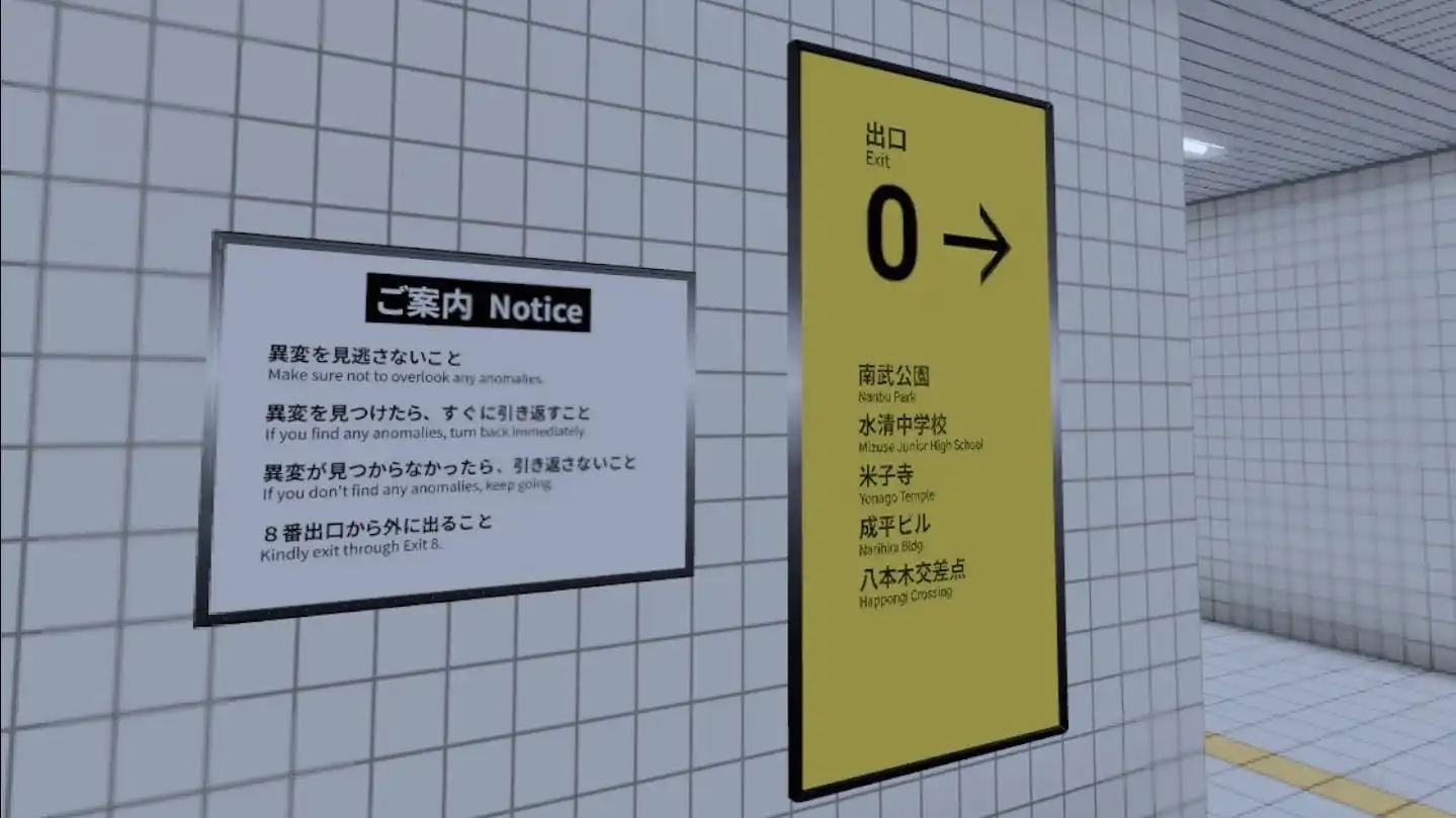 In The Exit 8 VR the goal is simple, reach Exit 8 of the very pristine Japanese underground metro station. Where the goal you might seem simple, you will soon notice that the passageways are never ending as you wonder through them. The you will notice a set of rules on a sign on the wall – notice any anomalies in the passageway turn around if not keep moving forward. Do this successfully and the Exit number on the sign will increase by one, get it wrong and it will return you to 0. So, make sure you pay close attention to anything and everything in this liminal space, or you will be stuck in a never ending loop of despair.