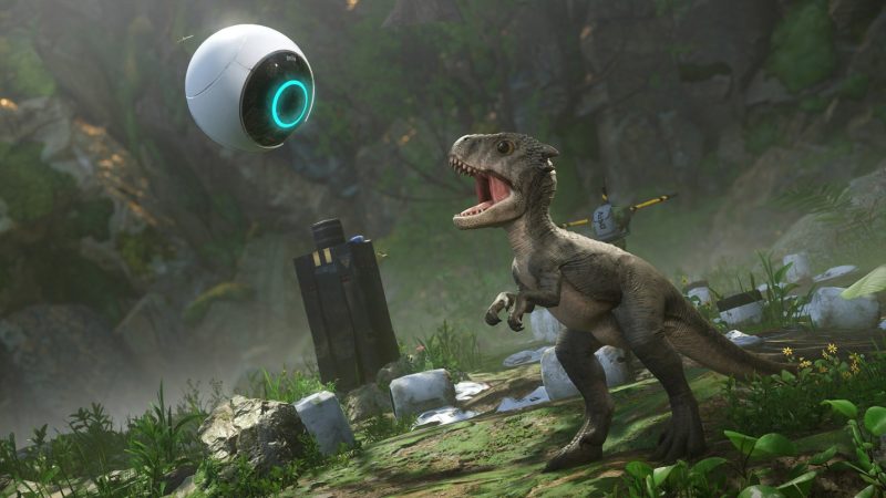 As the game starts you find yourself in-front of a nest of what are quite clearly dinosaur eggs, this is start of you getting to know the companions that will be with you throughout the game. Straight away an AI unit from the Esmeralda called HIGS will warn you of the danger of these eggs, due to them being T-Rex eggs. Not long after this an egg hatches and you are introduced to your second companion an orphaned T-Rex who becomes known as Laika. Both these characters become essential to your journey, and your survival. But, HIGS is not happy about you adopting Laika because he knows she is a dangerous animal, or will be one day – with him being against anything that could hurt Robin, all he can try to do is teach Robin she is a danger, and a waste of resources.