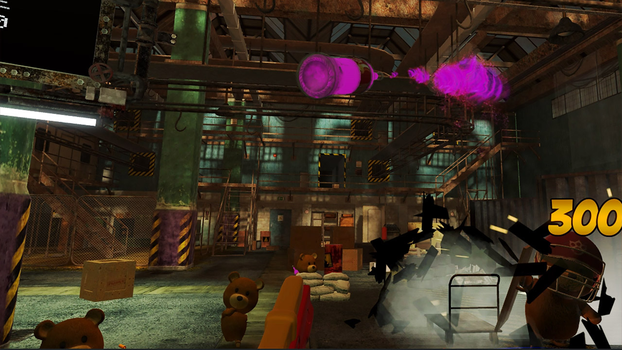 Sneaky Bears does come with a story. You play a faceless character as you try to take out the star of the game Frank. As mentioned Frank is a teddy gone evil and he has taken over a toy factory with an army of teddies, aiming to take over the world. You are introduced and tasked by a friendly teddy named Buddy to stop him using a set of toy guns – a simple premise, but, one that works.