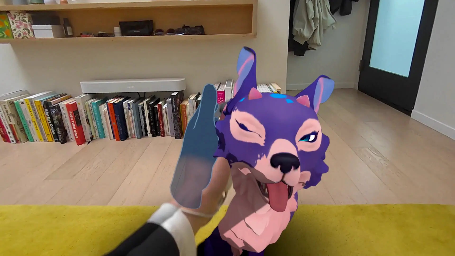 I was introduced to various interactions I could have with Ember in my gaming room, such as petting, brushing, feeding, and playing fetch. There were no limits to how often I could engage in these activities, and I found myself sitting on the floor, petting her for the first fifteen minutes, just to see her cute reactions. After completing all the necessary actions in my room, I could open a door that I placed which connected my space to Ember’s world. Stepping through this door would transport me from mixed reality into a fully immersive virtual reality world.